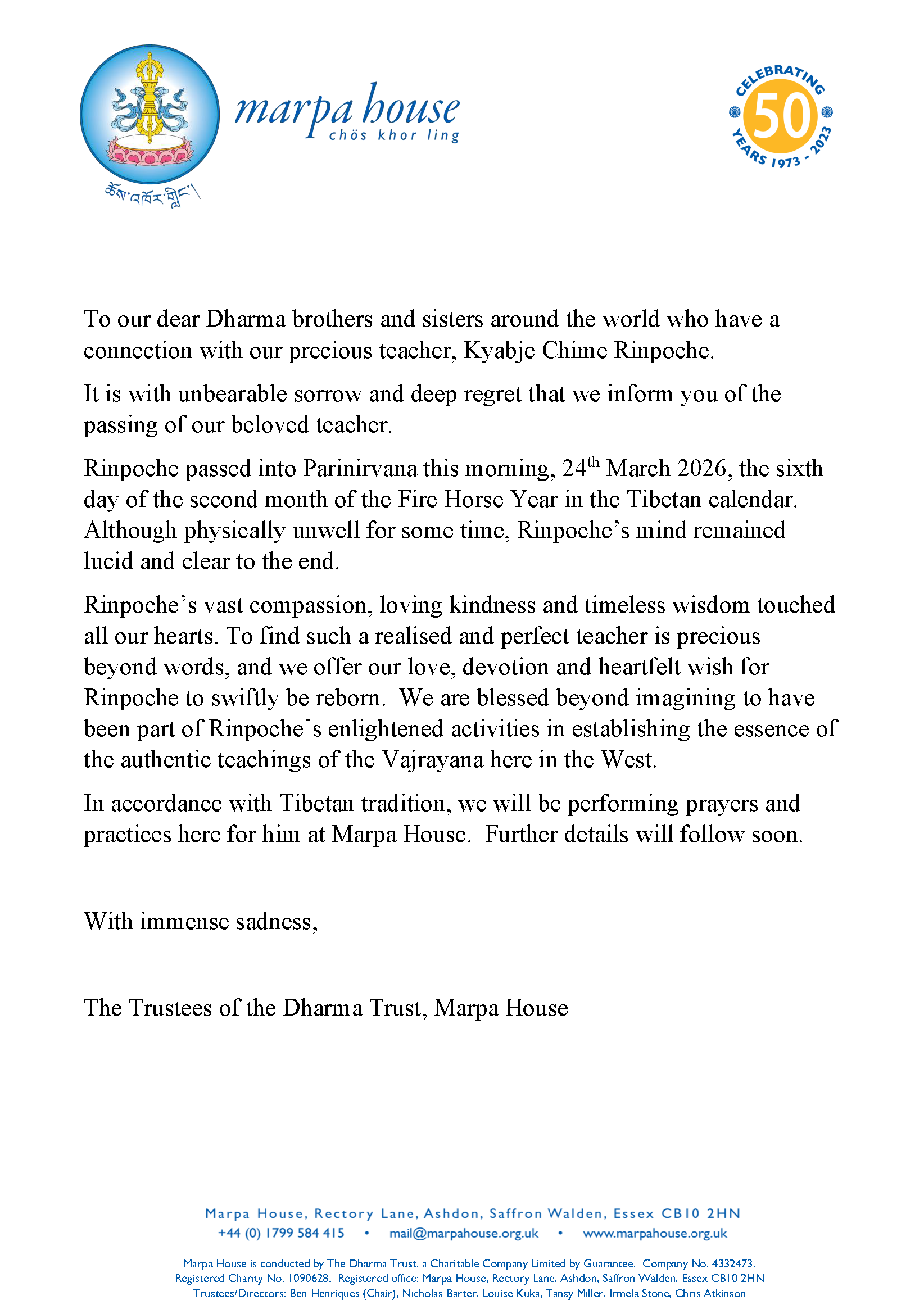 Marpa House is conducted by The Dharma Trust, a company limited by guarantee (no. 04332473) and registered with the Charity Commission (no. 1090628).