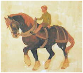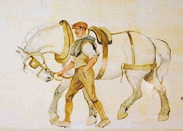 There is a small boy riding on a very large and striking horse called ‘Punch’, a man walking a harnessed working horse, and two pictures of dogs – one a domestic dog, and the other a hound.