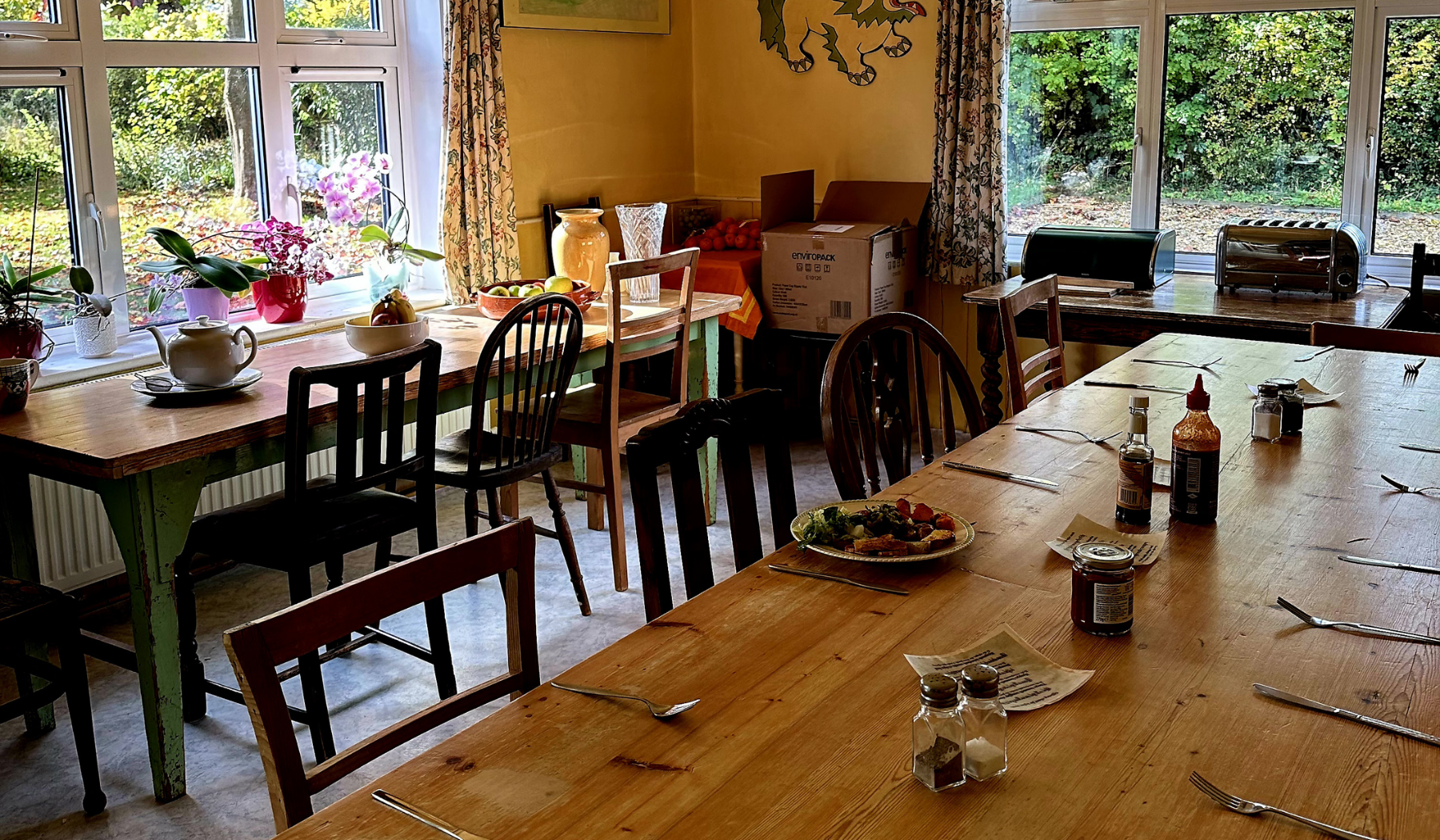 Please note: All meals are vegetarian. Whilst we offer soya milk, dairy-free margarine, honey, rice cakes etc. as alternatives, and are sometimes able to be flexible, we cannot generally accommodate special diets.